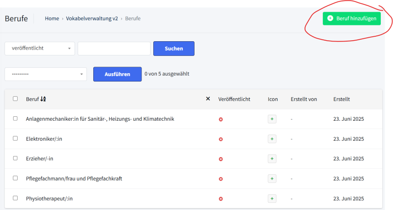 Hier wird der Zugang zur Lunes Verwaltung (CMS) voraussgesetzt. Die Vokabelliste wird im CMS eingepflegt. Dafür muss zuerst ein neuer Beruf, dann die (Sinn-)Einheiten und zuletzt die Vokabeln angelegt werden. Über das Menü links unten auf der CMS Startseite wird navigiert: