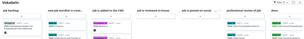 Um den Workflow für die Contenterstellung der Vokabeln für die Lunes App abzubilden und mehrere Berufsbilder gleichzeitig bearbeiten zu können, nutzen wir ein Board bei OpenProject https://tasks.tuerantuer.org/projects/lunes/boards60.