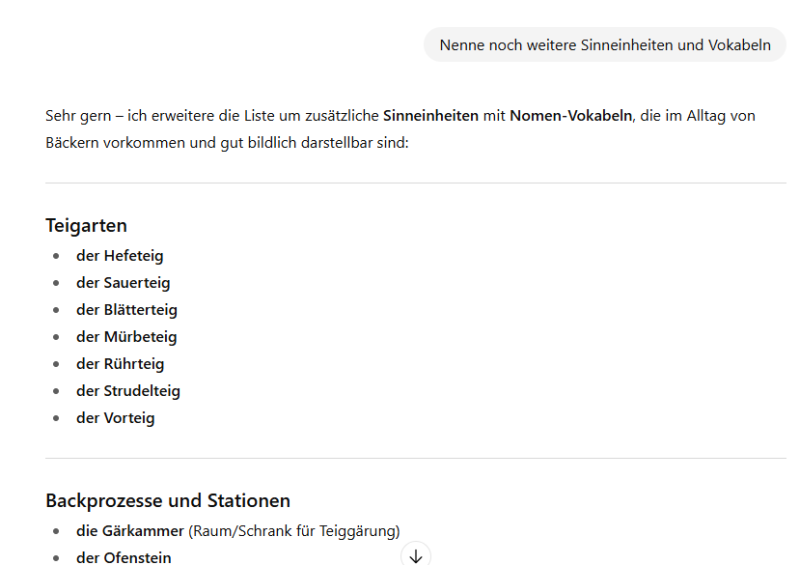 Je nachdem, wie viele Vokabeln generiert wurden, kann man ChatGPT nochmal nach weiteren Sinneinheiten und Vokabeln fragen: